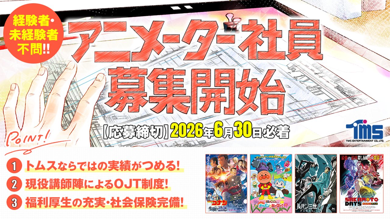 株式会社トムス・エンタテインメント(本社:東京都中野区 代表取締役社長:竹崎忠 以下、当社)は、ビジョンに掲げる「アニメSDGsの実現」に向けて、未来のアニメ制作を担うアニメーター人材を獲得・育成し、世界で愛される日本アニメの制作体制をより一層強化することを目的に、2027年4月入社のアニメーター社員募集を開始したことをお知らせいたします。