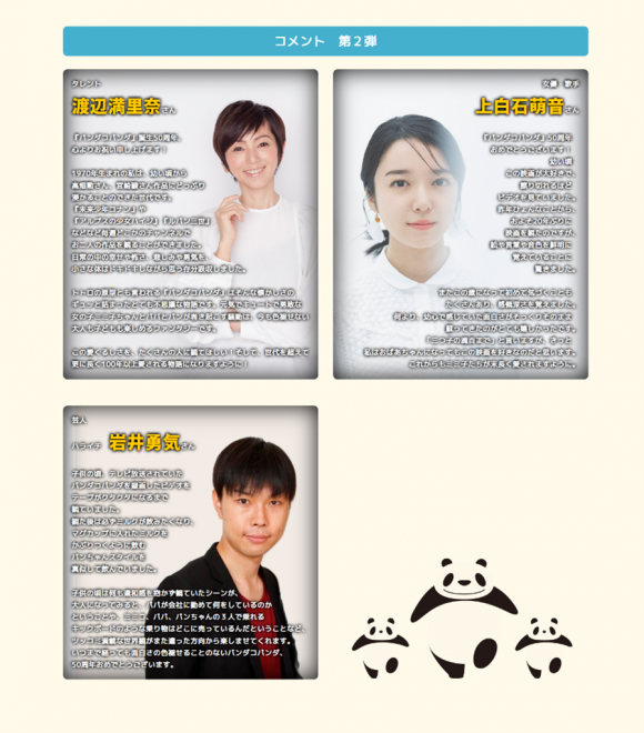 『パンダコパンダ』のアニバーサリーイヤー企画は今後も続報を予定しており、著名人の皆様からのお祝いコメント「PART3」も、順次パンダコパンダ公式ホームページにてご紹介させていただきます。