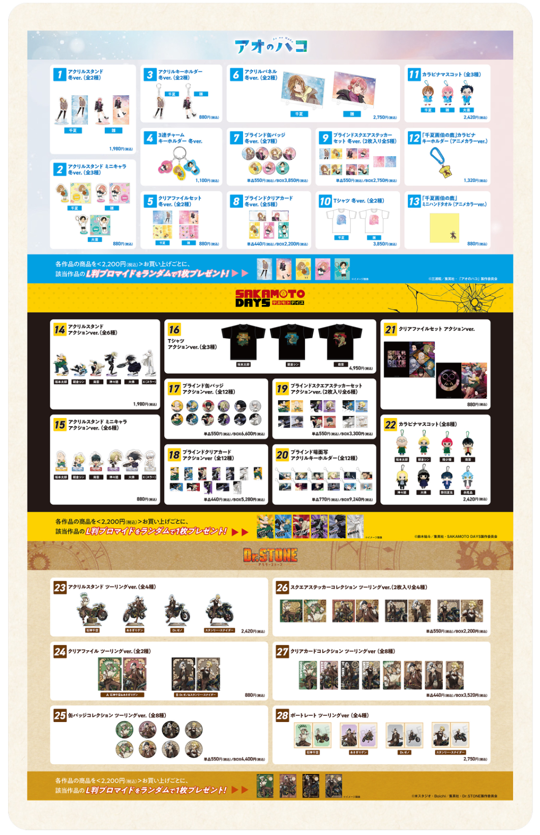 ブース来場者には、トムス/セガ フェイブブース限定のノベルティとして、『SAKAMOTO DAYS』JF2026限定缶バッジ、『アオのハコ』サボテンの種、『Dr.STONE』ステッカー、『アンデッドアンラック』大型ショッパーをそれぞれプレゼントいたします。